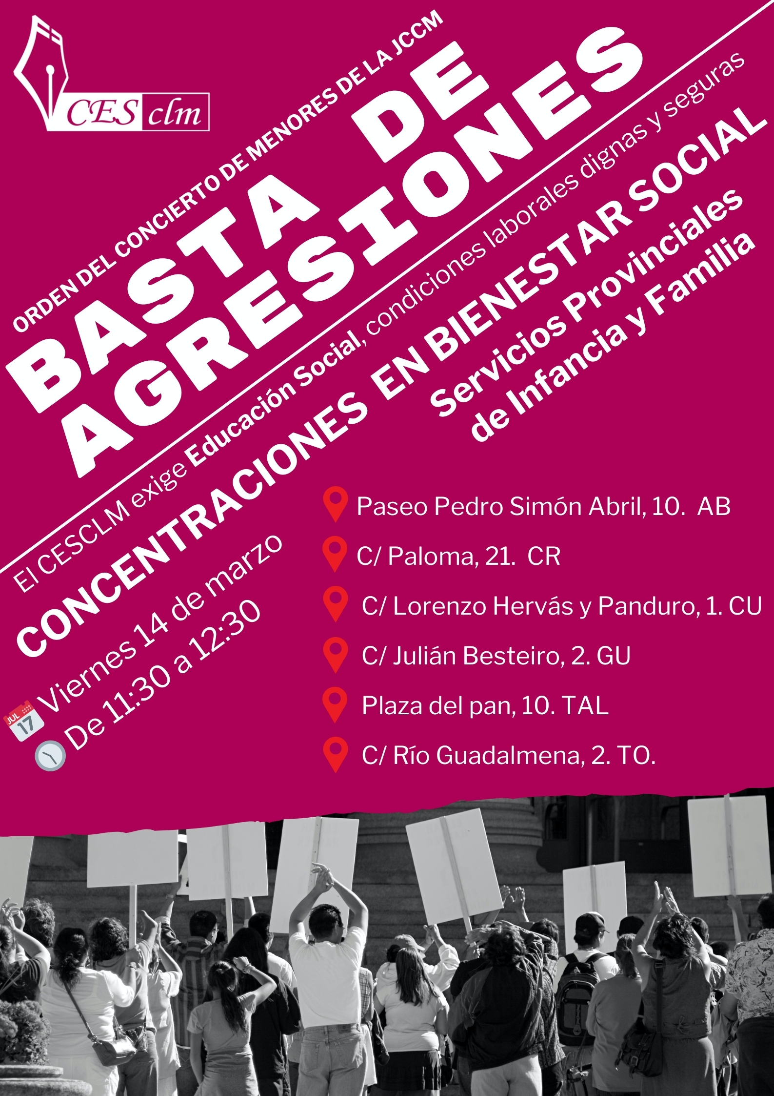 EL CESCLM EXIGE EDUCACIÓN SOCIAL, CONDICIONES LABORALES DIGNAS Y SEGURAS. CONCENTRACIONES 14 DE MARZO.
