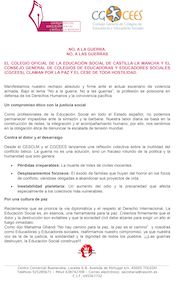 EL COLEGIO OFICIAL DE LA EDUCACIÓN SOCIAL DE CASTILLA-LA MANCHA Y EL CONSEJO GENERAL DE COLEGIOS DE EDUCADORAS Y EDUCADORES SOCIALES (CGCEES), CLAMAN POR LA PAZ Y EL CESE DE TODA HOSTILIDAD.